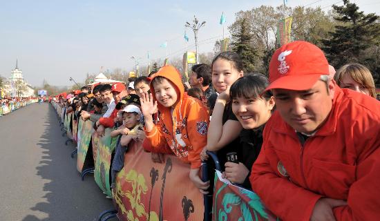 4月2日,阿拉木图民众在阿斯塔纳广场外等待奥运圣火到来。当日,北京奥运会火炬传递活动在哈萨克斯坦最大城市阿拉木图进行,跨越五大洲的奥运圣火境外之旅由此拉开帷幕。新华社记者安治平摄